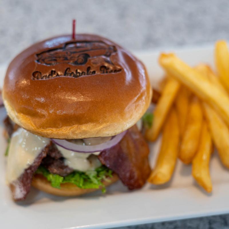Fresh local ground Angus BEEF Burgers! All burgers are served with lettuce, tomato, onion, coleslaw or macaroni salad, pickle, fries, chips, baked potato, or small green salad. Deluxe with sweet potato fries, onion rings, waffle fries, curly fries, or tater tots $2.50 charge.